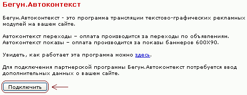 затем выбираем "Бегун.Автоконтекст" и нажимаем на кнопку "Подключить".